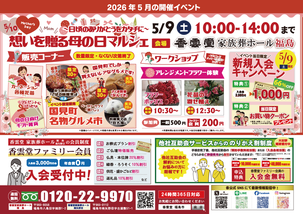 <福島>★2026.5.9(土) 香雲堂(こううんどう)家族葬ホール福島 想いを贈る母の日マルシェ開催のお知らせ