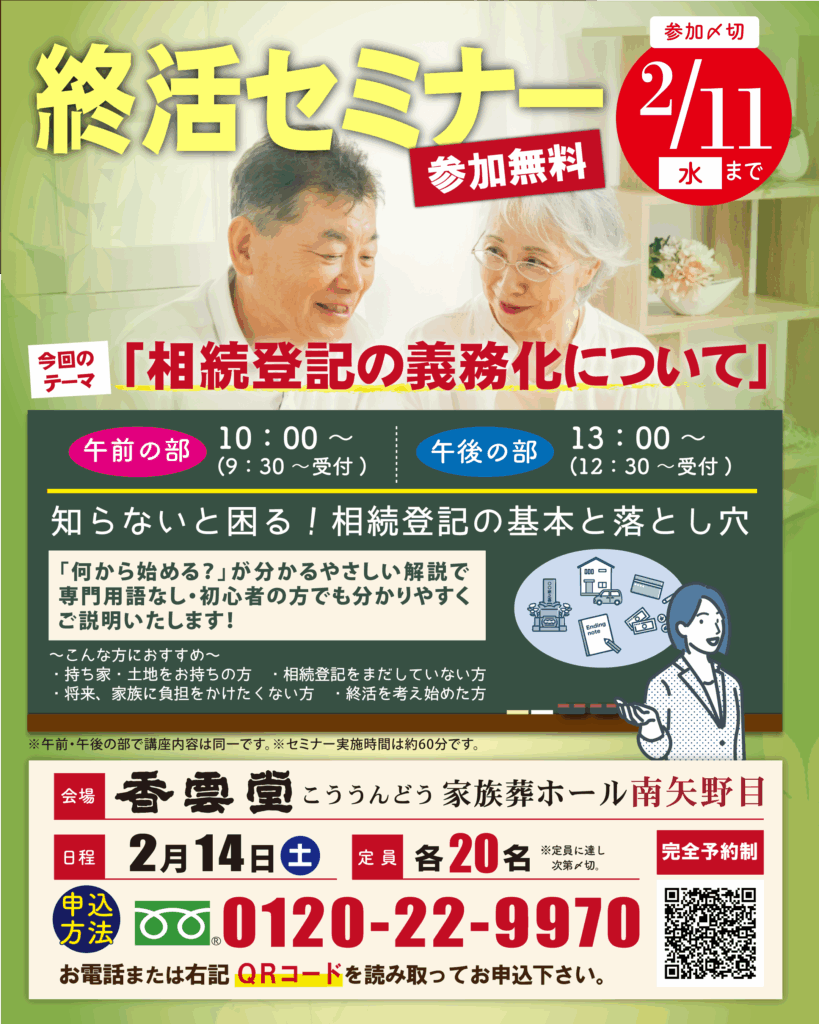 <南矢野目>★2026.02.14(土) 香雲堂(こううんどう)家族葬ホール南矢野目 終活セミナー開催のお知らせ